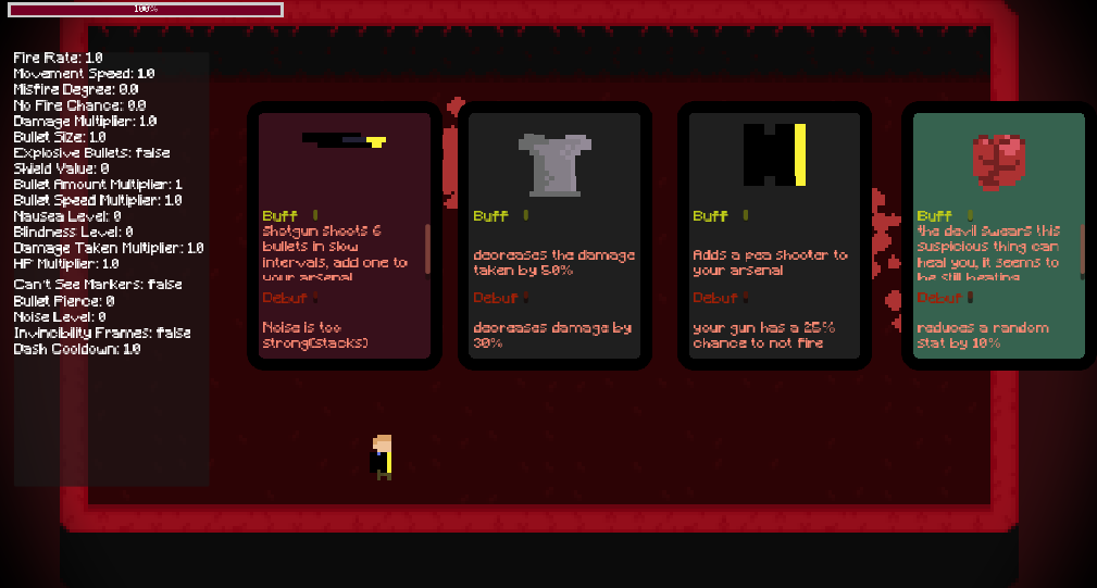 This game was made for Jamination8(unrated) gamejam within 48 hours for the theme Unstable. Your wife is deceased and the devil offers you a deal to get her back, it is just that you only need to make it to the 9th floor of hell. The devil plays with you and gives you buffs with corresponding debuffs, making picking up buffs unstable and with risk